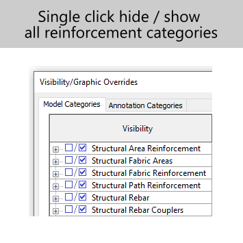 Turns off / on the visibility of reinforcement categories in the Visibility / Graphics dialog.